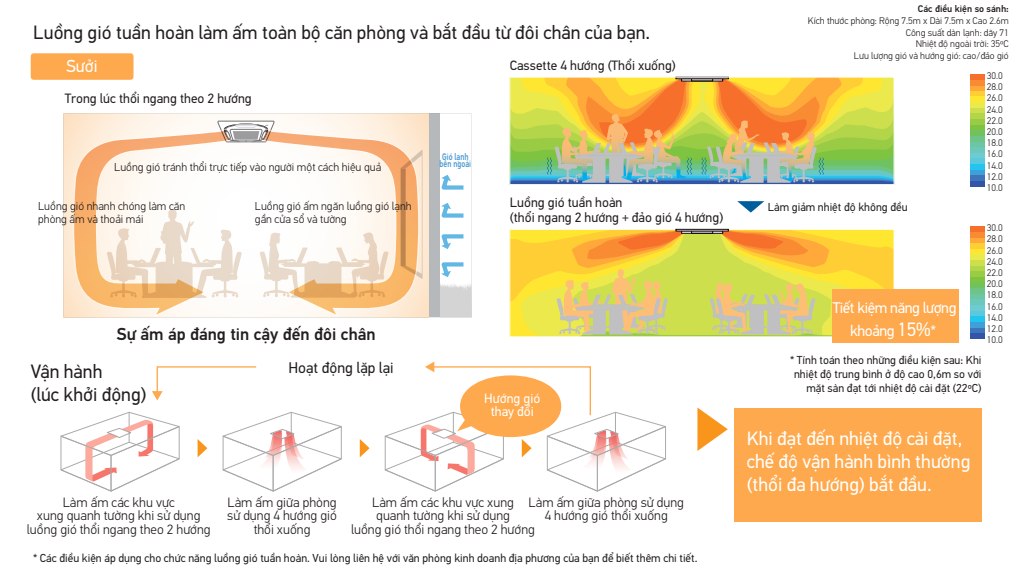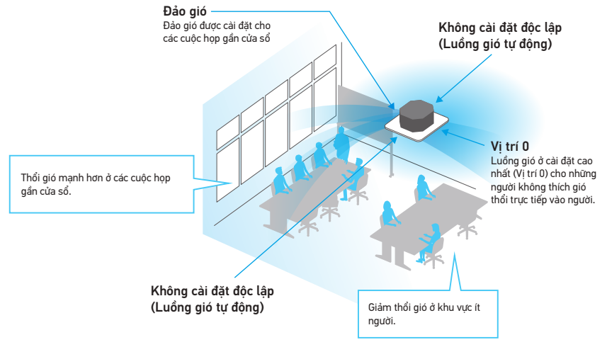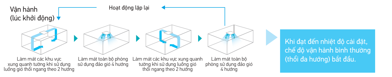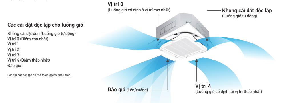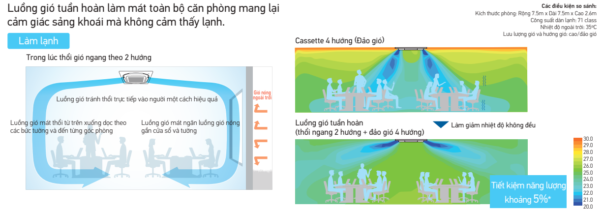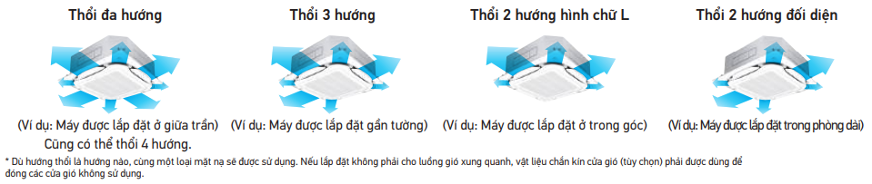 Sự thoải mái được cung cấp cho toàn bộ căn phòng bằng cách cài đặt riêng tương ứng với các điều kiện thổi 4 hướng.
