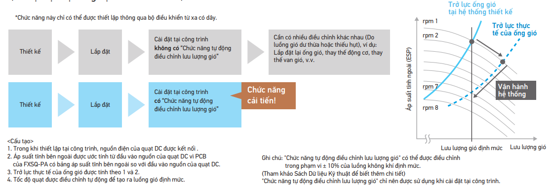 - "Chức năng tự động điều chỉnh lưu lượng gió” lắp đặt tại công trình (cài đặt cục bộ bằng bộ điều khiển từ xa)